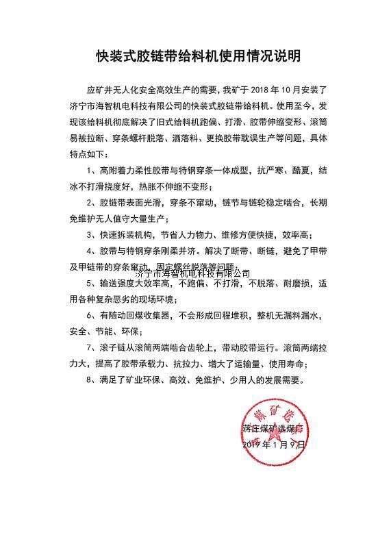 快裝式膠鏈帶給料機可實現(xiàn)完美替代物料運輸系統(tǒng)在用的所有形式的給料機,包括甲帶給料機、帶式給料機、振動給料機、往復式給料機、鏈板給料機等,膠鏈帶給料機更好的解決了跑偏、打滑、換裝困難等問題,更利于實現(xiàn)快速裝車、高效自動化的現(xiàn)代智能運輸系統(tǒng)要求。