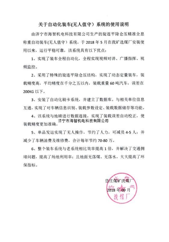 本產(chǎn)品一經(jīng)推出即獲得各大設計院及用戶的一致好評,率先在棗礦集團岱莊煤礦取得成功應用,2018年9月受邀參加了《棗礦集團煤場封閉暨儲裝運系統(tǒng)智能化升級改造現(xiàn)場會》,智能裝車系統(tǒng)得到了充分肯定!我司憑借雄厚的加工制造實力及過硬的創(chuàng)新技術能力,勢必為運輸稱重系統(tǒng)、快速計量裝車系統(tǒng)帶來又一次的技術創(chuàng)新變革。