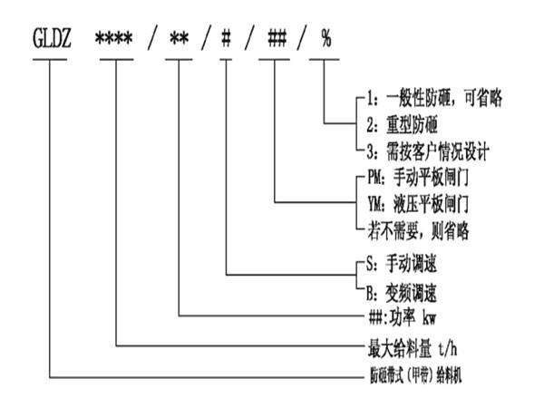防砸閥門帶式(甲帶)給料機(jī)型號(hào)說明:
